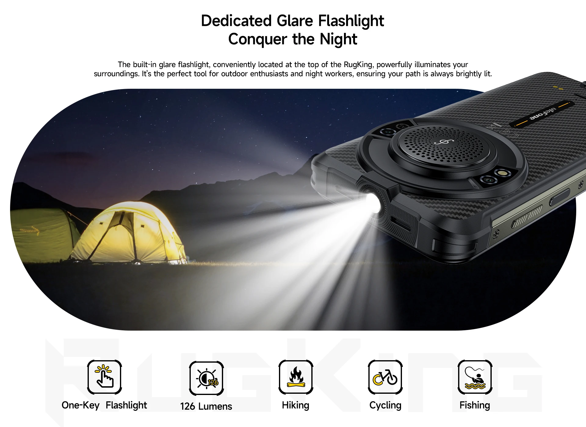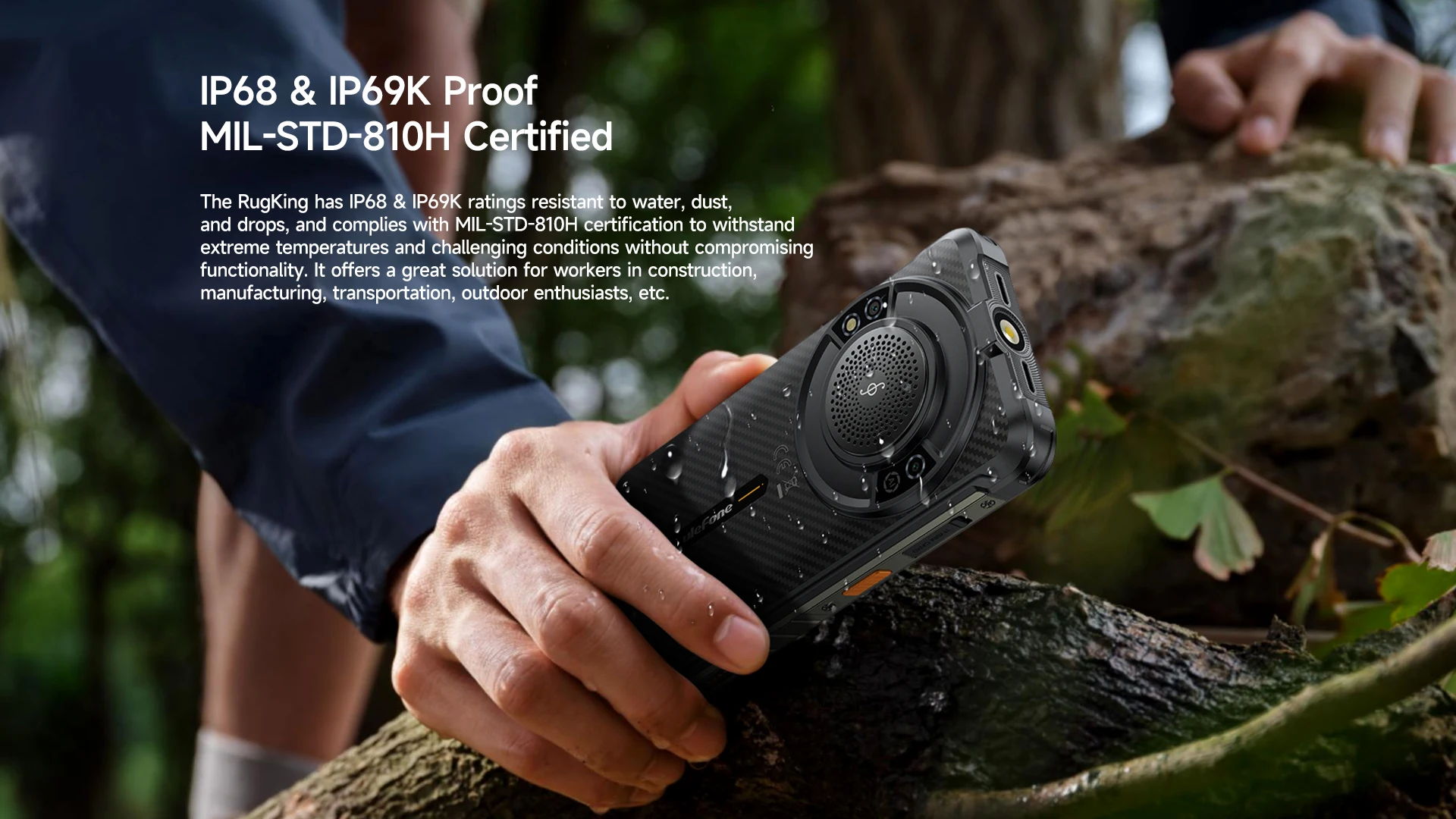●RugKing is splash, water, and dust resistant and was tested under controlled laboratory conditions with a rating of IP68 under IEC standard 60529 (maximum depth of 1.8 meters up to 30 minutes). Charger and accessories are not water-resistant. Splash, water and dust resistance are not permanent and might decrease as a result of normal wear. Do not attempt to charge a wet RugKing Liquid damage not covered under warranty.