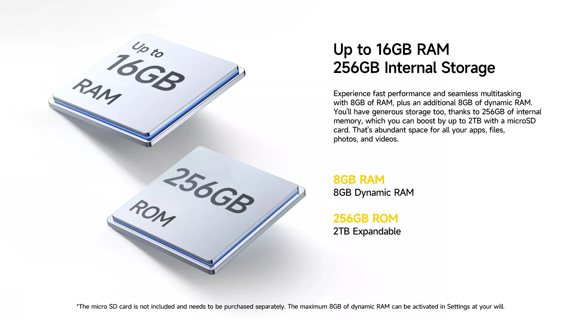 8GB RAM + 8GB dynamic expansion for seamless multitasking. 256GB storage, expandable up to 2TB.