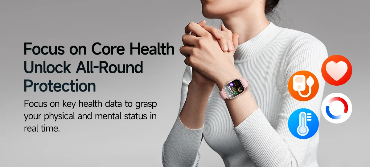 - Metrics measured: Heart Rate Monitor,Women’s Health Monitoring,Other,Blood Oxygen Monitor,Sleep Monitor,Blood Pressure Monitor,Body Temperature Monitor,Stress Monitor