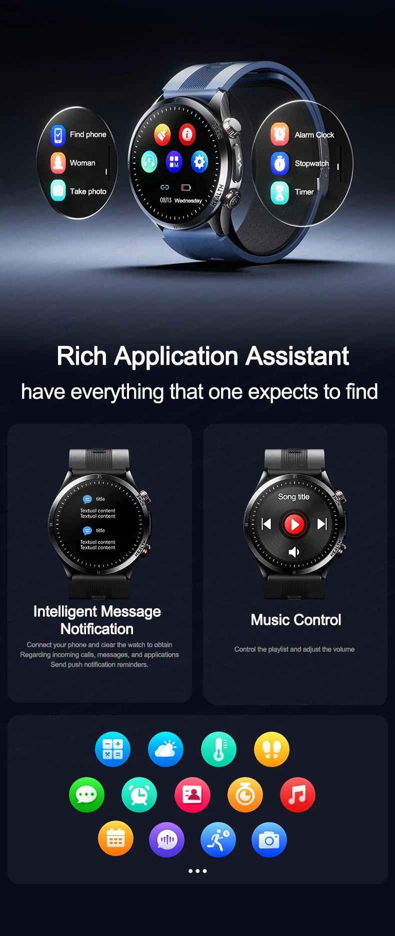 - Weather forecast, stopwatch,: Call and message reminders,