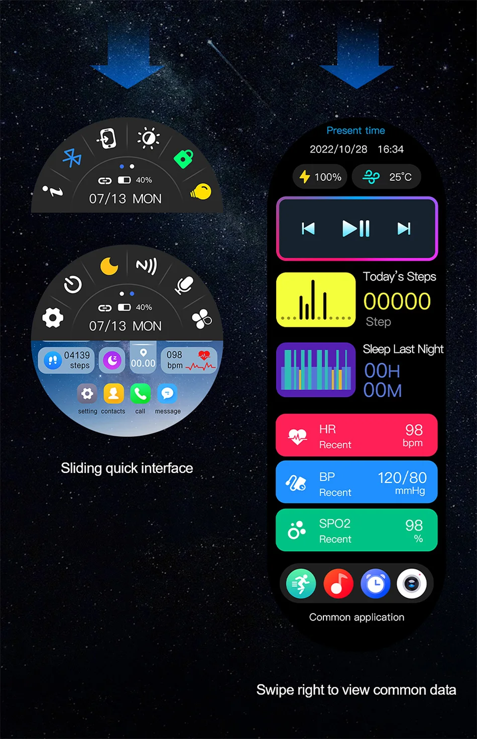 “Basic functions: compass, telephone (contact person, call record, dial pad, call setting, SOS), message push, exercise, step counting, sleep detection, music, heart rate, blood pressure, blood oxygen, body temperature, women’s health detection, medicine taking reminder, water drinking reminder, sedentary reminder, style switching, calendar, voice assistant, weather, photo taking, calculator, etc.