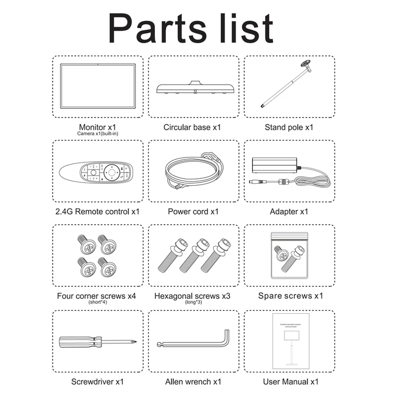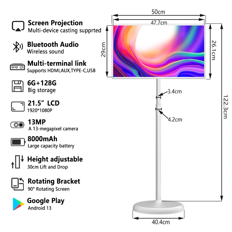 【Long-lasting battery life and wireless projection support】Portable TV is composed of a smart touch screen, a pole, and a base with a battery. The battery capacity is 12V, 8000mAh. Once fully charged, it can be used continuously for 4-6 hours.