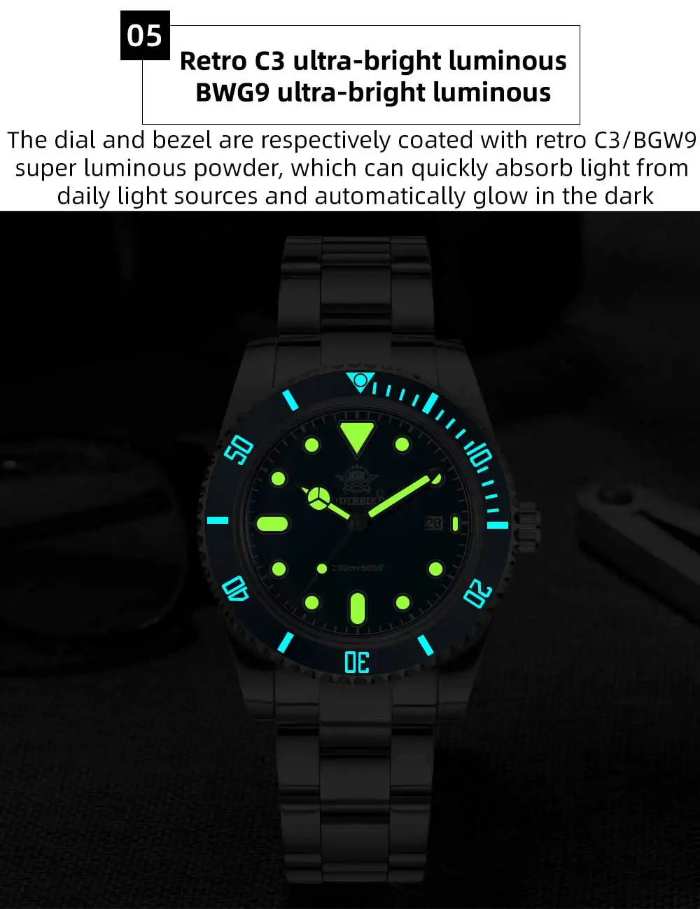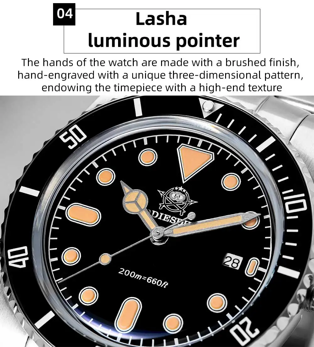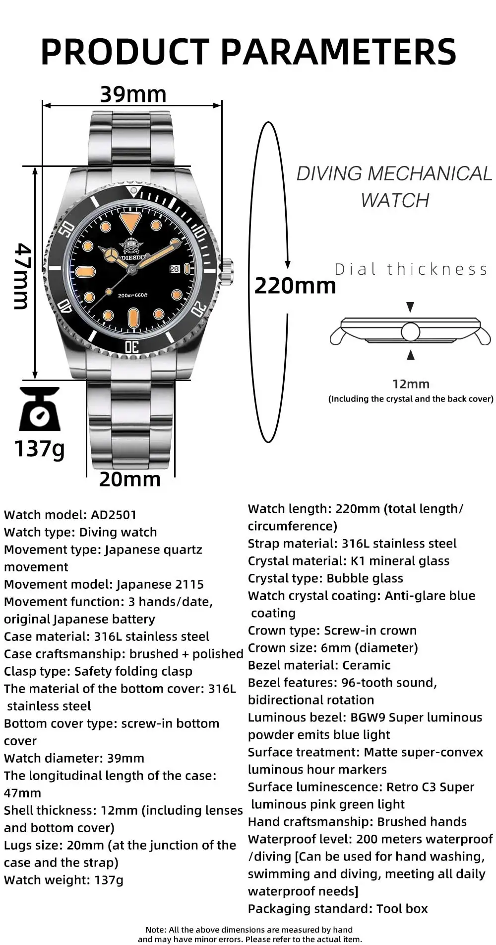 - Feature: Screw crown,Luminous,Complete Calendar,DIVER,Water-Resistance,swim