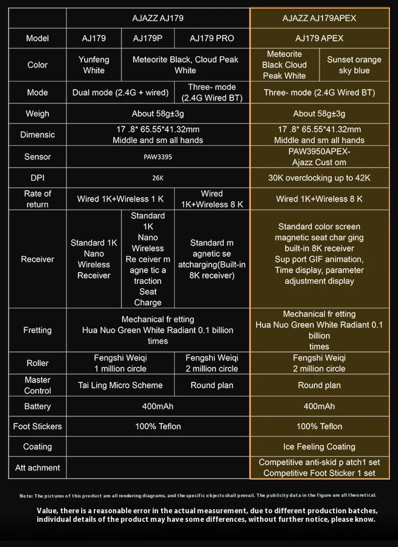 AJAZZ AJ179 / AJ159 APEX is powered by Pixart’s flagship sensor PAW3950, which is fine-tuned for optimal performance. It has a maximum sensitivity of 30,000 DPI, can be overclocked to 42,000 DPI, a tracking speed of 750 IPS and 50G acceleration. These features make AJ159 APEX stand out in the market, providing unparalleled precision and speed.