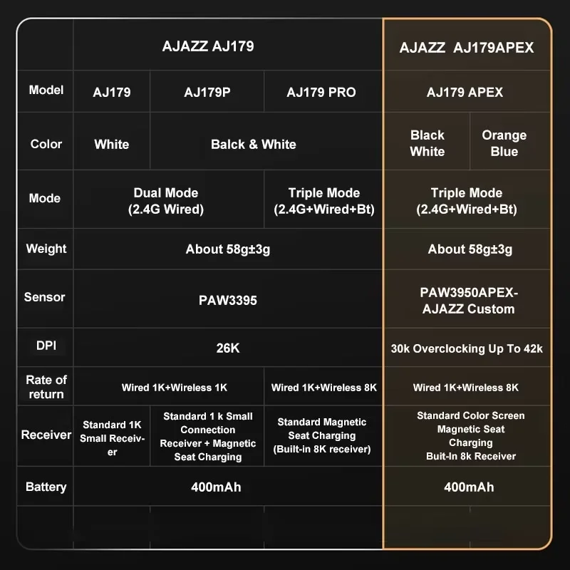 AJ179 APEX is equipped with a 400mAh battery, which incorporates AJAZZ’s advanced low-power technology, significantly extending battery life and supporting long-term gaming without the need for frequent charging.