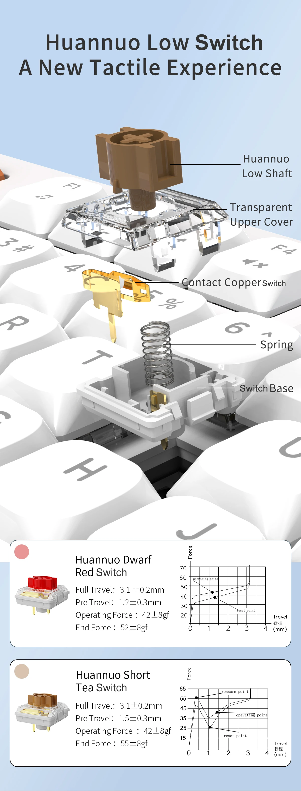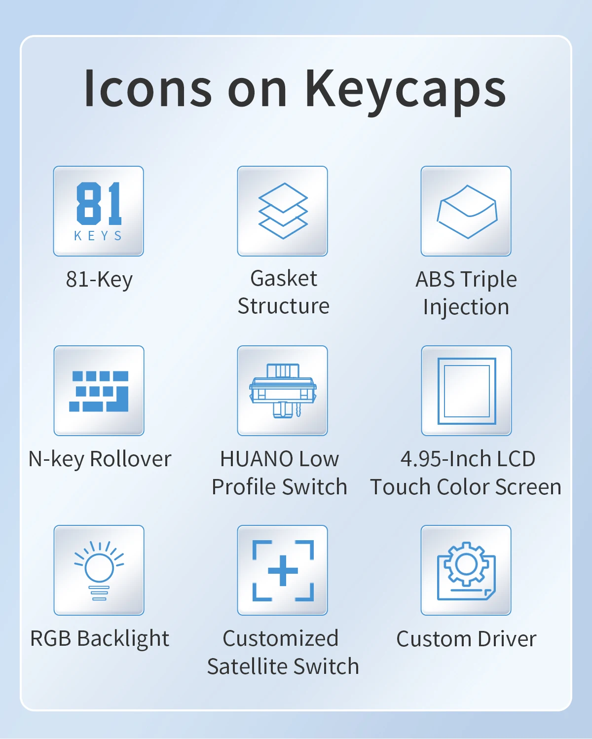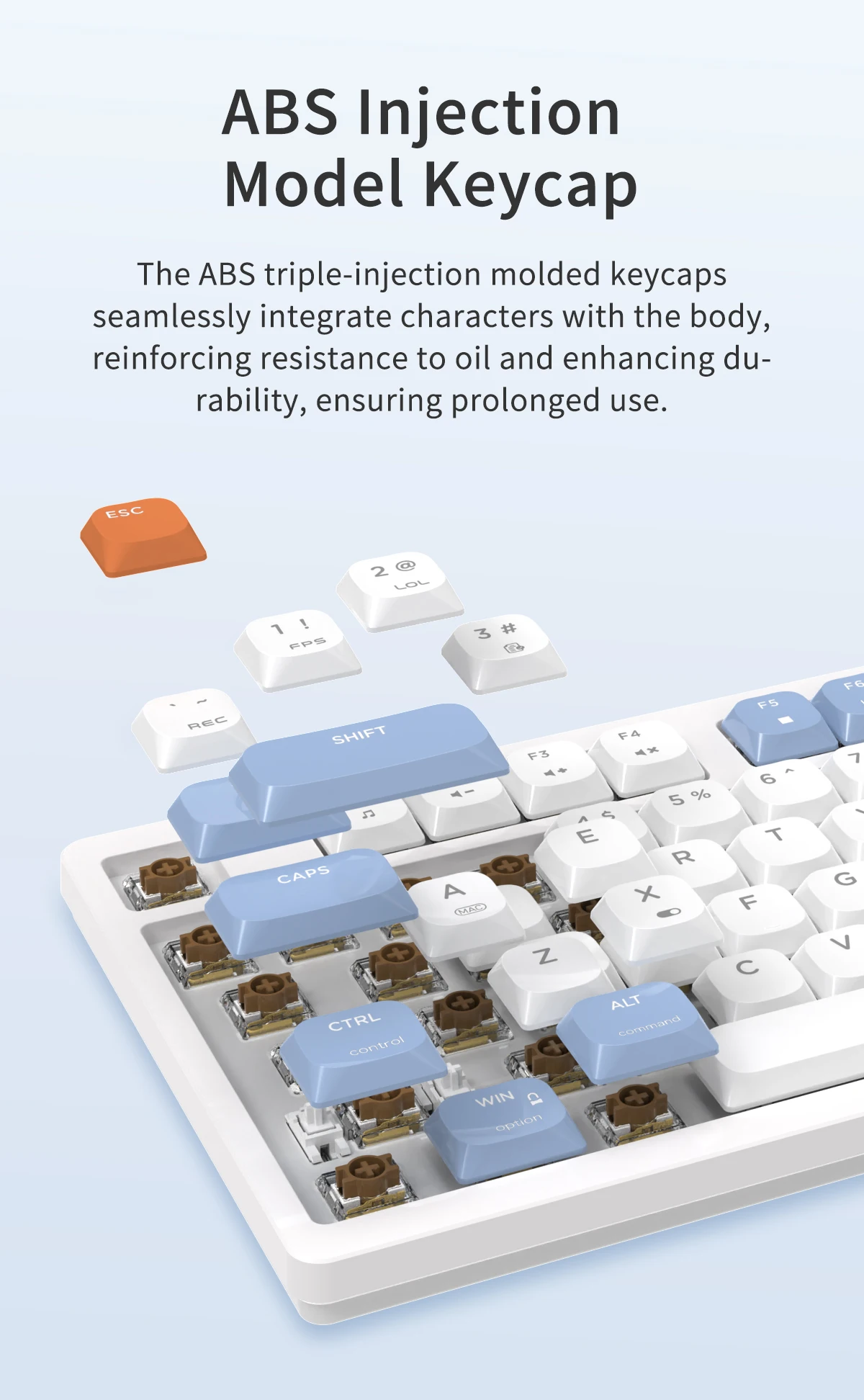 Keycap Material: Low Shaft Height ABS Material(Three Colors)