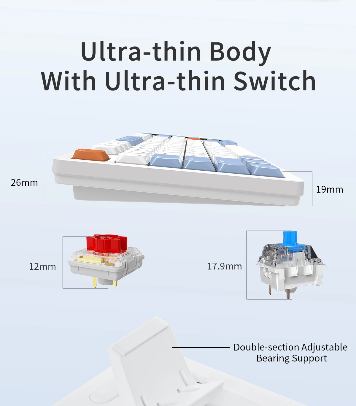 Ultra-Thin Design: Say goodbye to bulky keyboards without sacrificing the tactile feedback of mechanical switches. AKP815 boasts an ultra-thin design, thanks to its low-profile HUANO mechanical switches and sleek keycaps. Enjoy mechanical typing experience with minimal power consumption while ensuring optimal wrist comfort.