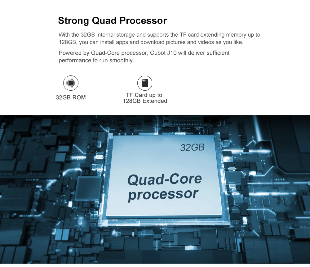 With the 32GB internal storage and supports of the TF card extending memory up to 128GB, you can install apps and download pictures and videos as you like. Powered by a Quad-Core processor, Cubot J10 will deliver sufficient performance to run smoothly.
