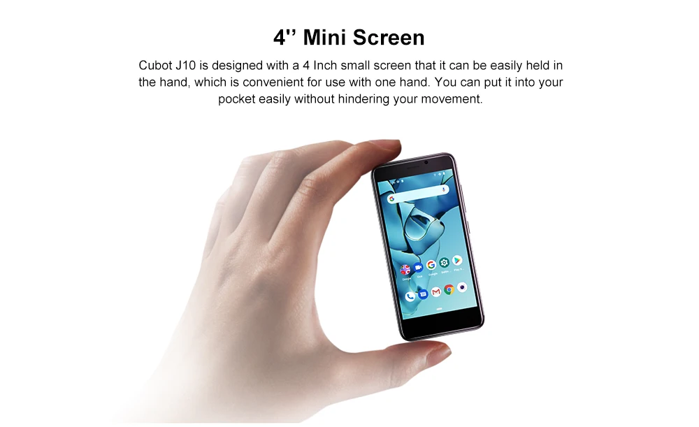 Cubot J10 is designed with a 4-inch small screen that can be easily held in the hand, which is convenient for use with one hand. You can put it into your pocket easily without hindering your movement.