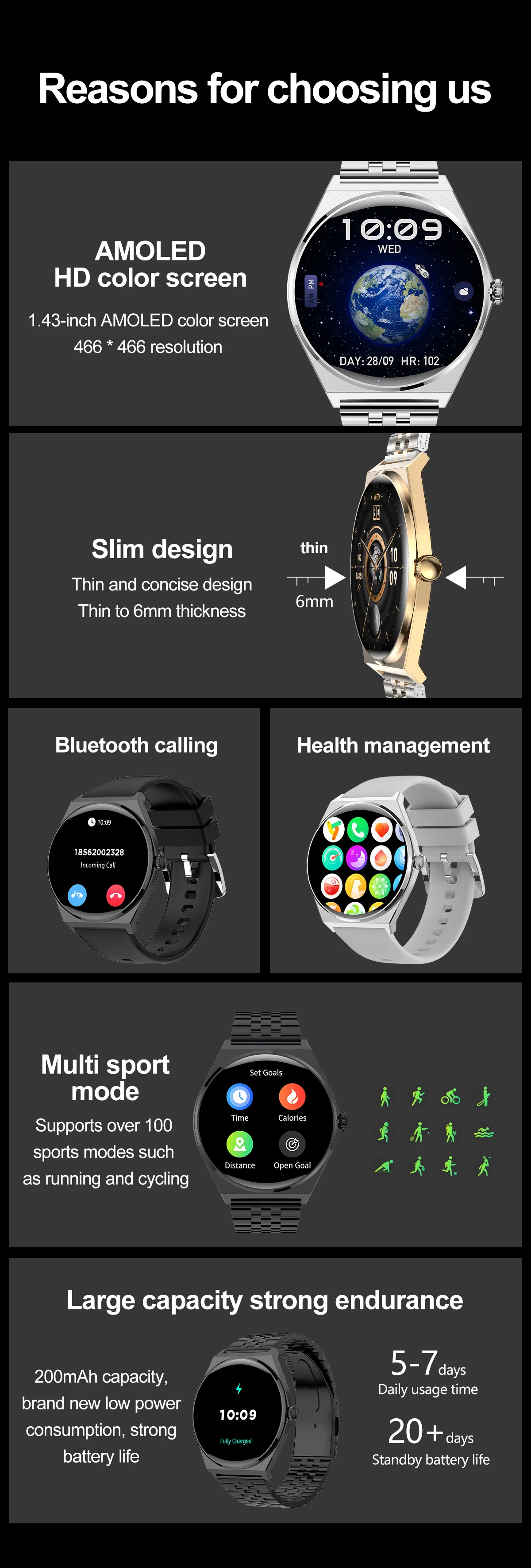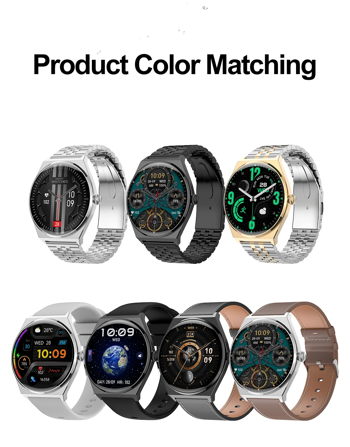 - Function: Passometer,fitness tracker,sleep tracker,Message Reminder,Call Reminder,Answer Call,Dial Call,Remote Control,Push Message,24 hour instruction,Chronograph,Alarm Clock,Calorie Counter,Power Reserve,PRAYER,Phase of the Moon,Speed Measurement,Month,Heart Rate Tracker,Interactive Music,Noctilucent,Calendar,Compass,Lighting,Countdown,Calculators