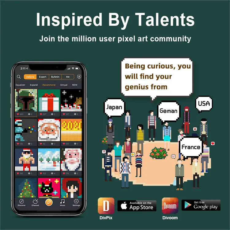 Pixel art creation on the Timebox-Evo is so easy and fun.You can take and convert a picture instantly into a pixel art design,or you can make pixel art animation as well.Share your artworks in our community in the free app—Divoom. Enjoy the funny pixel art world now!