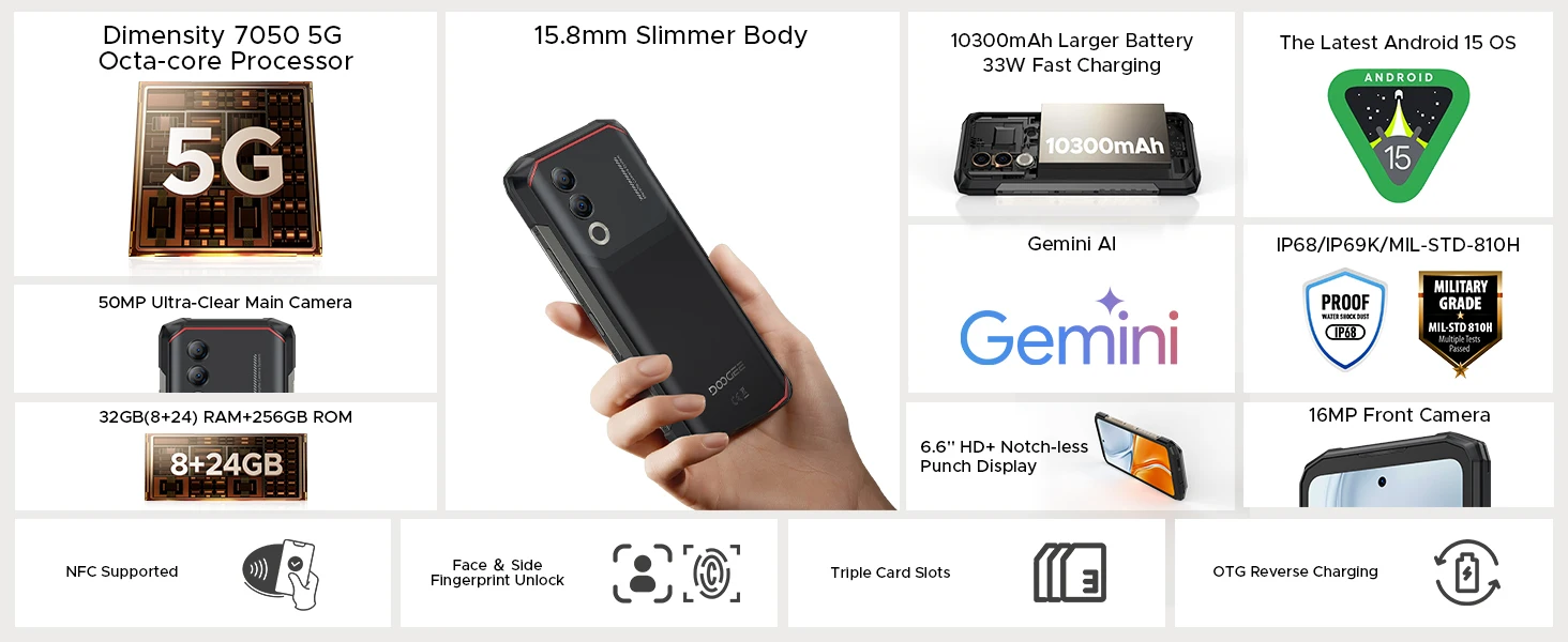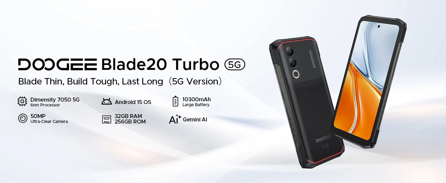 DOOGEE Blade20 Turbo 5G Rugged Phone Gemini Al 6.6” 10300mAh Battery 32GB(8+24) 256GB 50MP Camera Android 15 NFC Mobile Phone