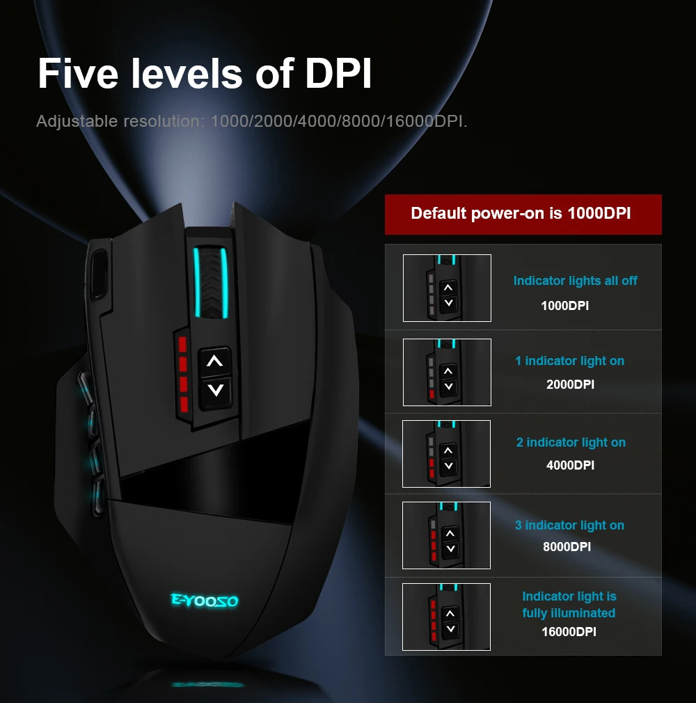 5 DPI specially designed for e-sports-Equipped with 5 onboard DPI levels (1000/2000/4000/8000/16000), allowing you to easily switch between different needs. Personalized DPI ± 100 can meet your unique needs and shorten the use time.
