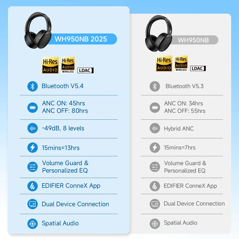 WH950NB supports LDAC high-resolution audio decoding and is certified for Hi-Res Audio in both wired and wireless modes. With an extended frequency response up to 40kHz, it delivers stunning detail and clarity, bringing you closer to studio-quality, near-lossless audio.