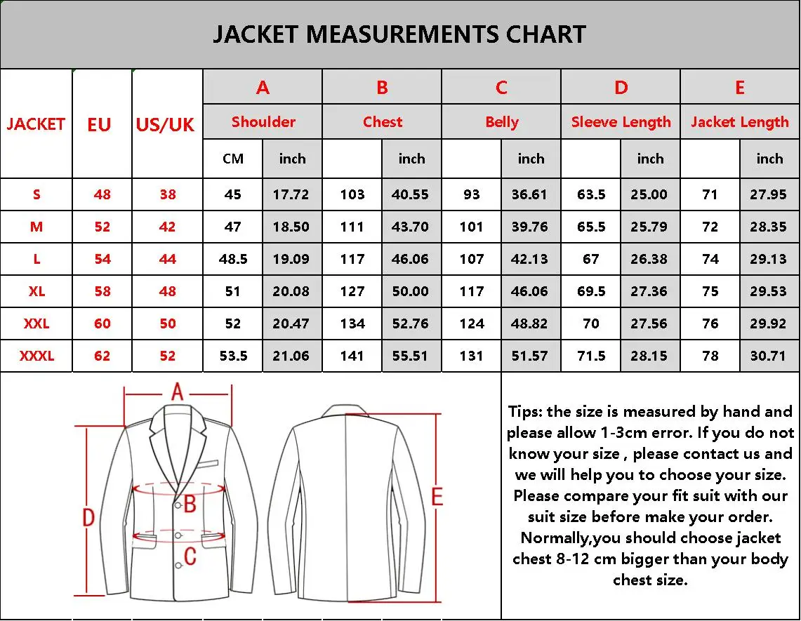 If you need a custom size ,please send these body measurements to our customer service, Please make sure these body measurements are correct ,it is very important (Ruler close to body skin when measuring, tailors will sew 8-12 cm bigger of customized jacket chest measurement on your body chest measurements) :