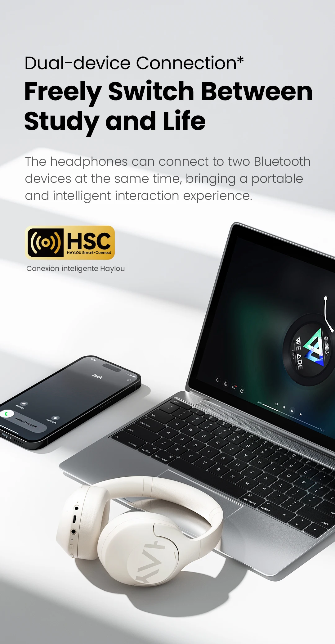 The headphones can connect to two Bluetooth devices at the same time, bringing a portable and intelligent interaction experience.