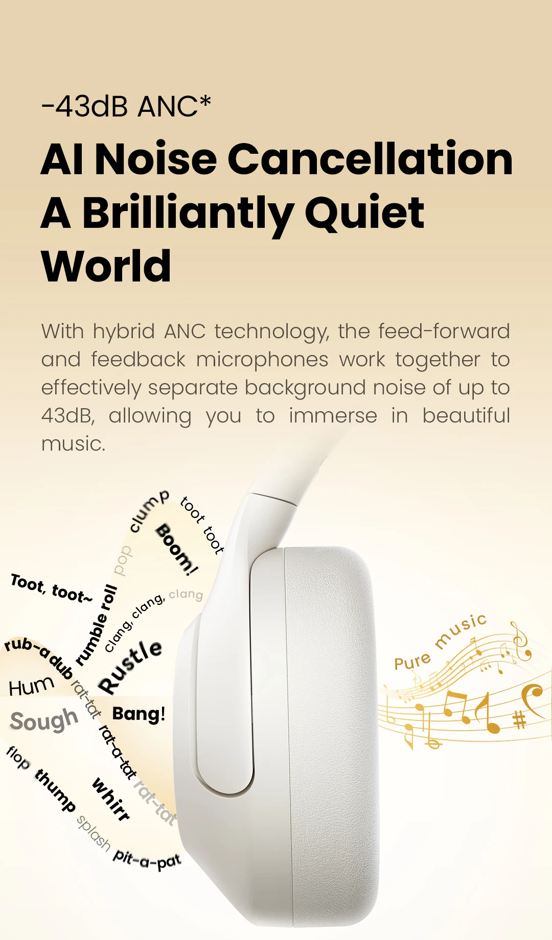 A Brilliantly Quiet WorldWith hybrid ANC technology, the feed-forward and feedback microphones work together to effectively separate background noise of up to 43dB, allowing you to immerse in beautiful music.