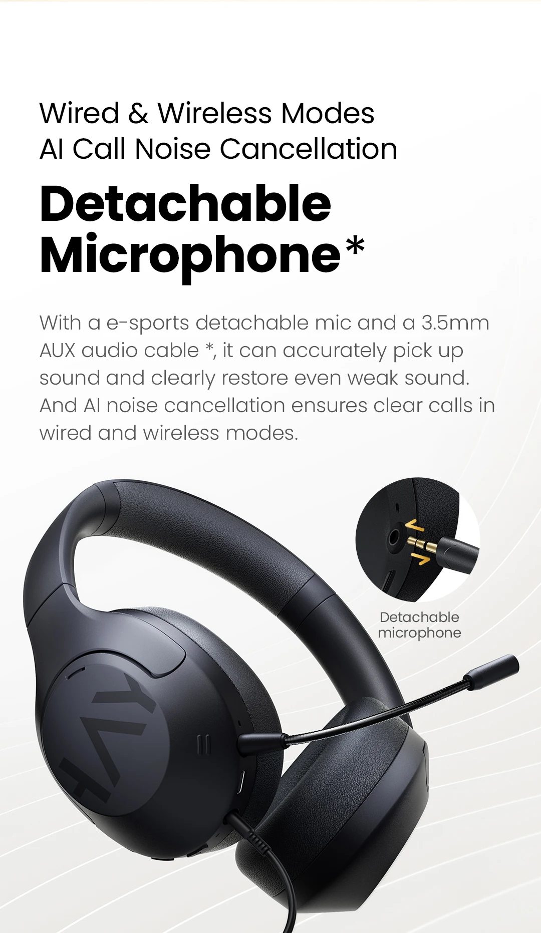With a e-sports detachable mic and a 3.5mm AUX audio cable , it can accurately pick up sound and clearly restore even weak sound. And AI noise cancellation ensures clear calls in wired and wireless modes.