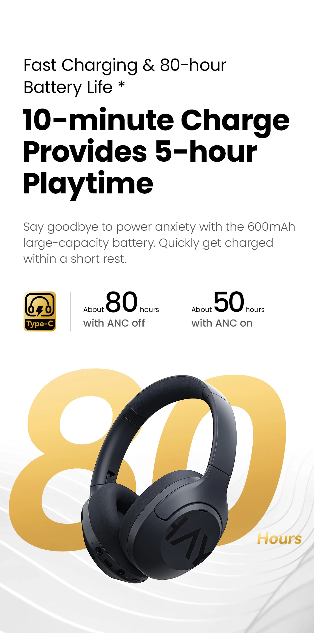 - Headphone battery life: ANC off, about 80 hours ,ANC on, about 50 hours