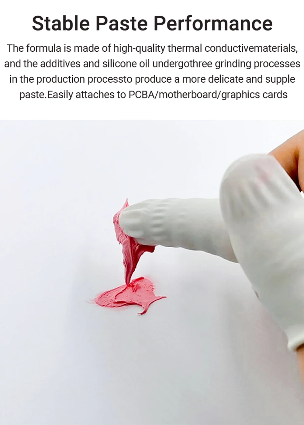 The formula is made of high-quality thermal conductivematerials, and the additives and silicone oil undergothree grinding processes in the production processto produce a more delicate and supple paste. Easily attaches to PCBA/motherboard/graphics cards