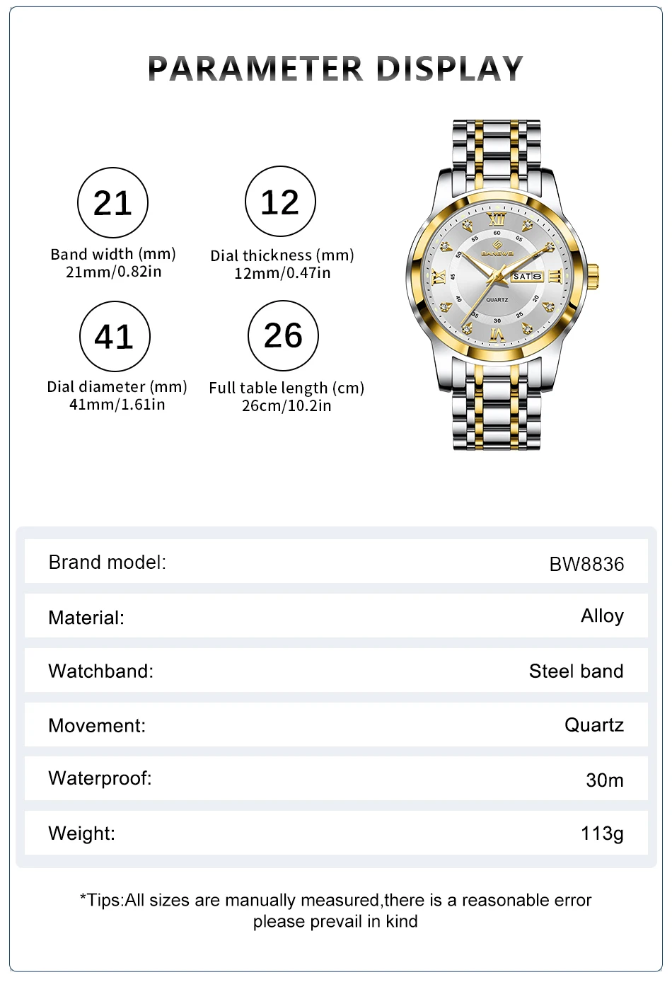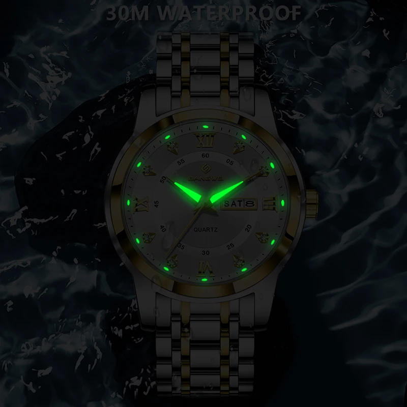 - Feature: Stop Watch,Shock Resistant,Luminous,Auto Date,Complete Calendar,Water-Resistance,swim,Week Display,Luminous Hands
