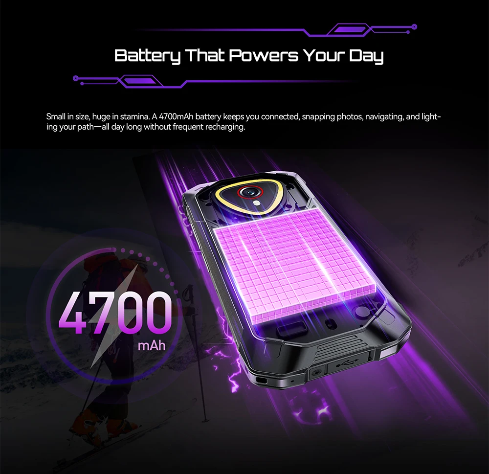 Small in size, huge in stamina. A 4700mAh battery keeps you connected, snapping photos, navigating, and lighting your path—all day long without frequent recharging.
