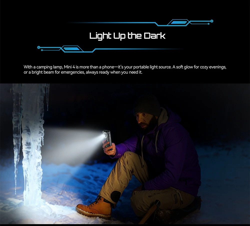 With a camping lamp, Mini4 is more than a phone—it’s your portable light source. A soft glow for cozy evenings, or a bright beam for emergencies, always ready when you need it.