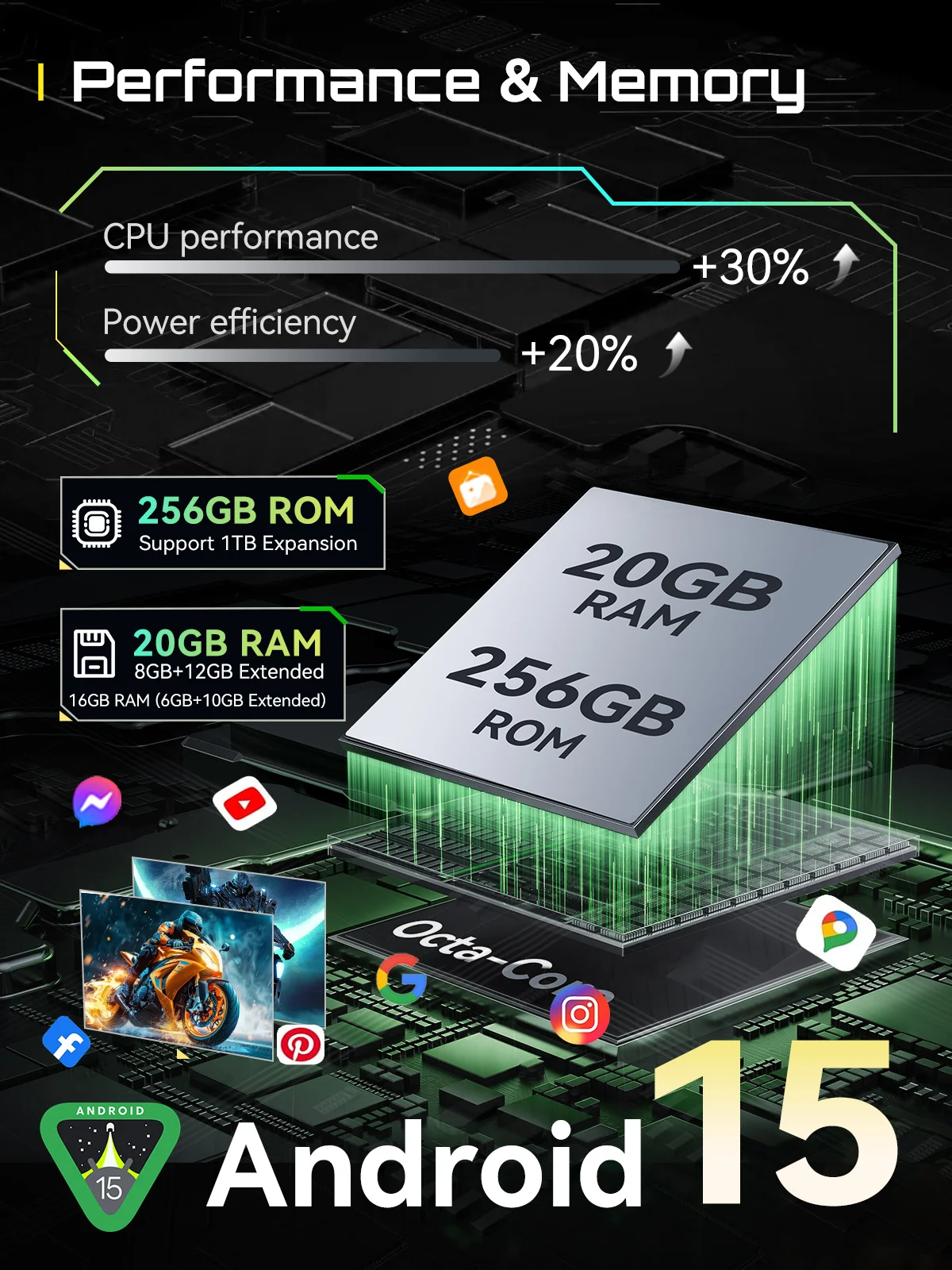 - 20GB RAM: 8GB+12GB Extended