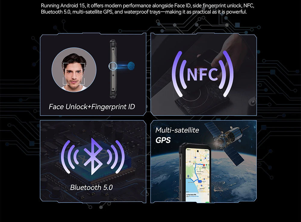 Running Android 15, it offers modern performance alongside Face ID, side fingerprint unlock, NFC, Bluetooth 5.0, multi-satellite GPS, and waterproof trays—making it as practical as it is powerful.
