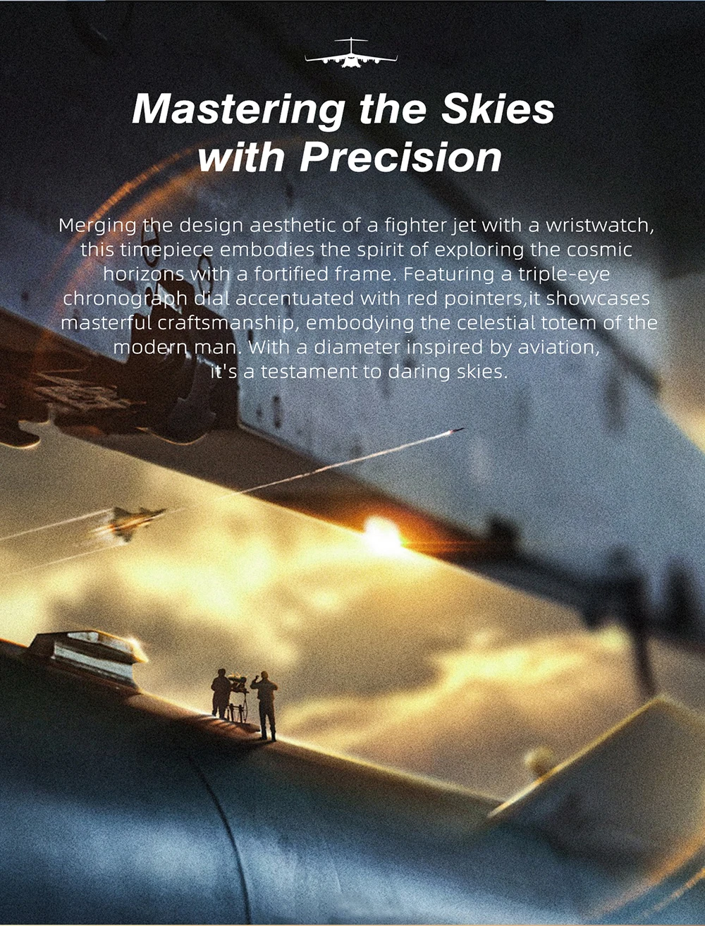 Merging the design aesthetic of a fighter jet with a wristwatch, this timepiece embodies the spirit of exploring the cosmic horizons with a fortified frame. Featuring a triple-eye chronogranh dial accentuated with red pointers, it showcases masterful craftsmanship, embodying the celestial totem of the modern man, With a diameter inspired by aviation, It’s a testament to daring skies.