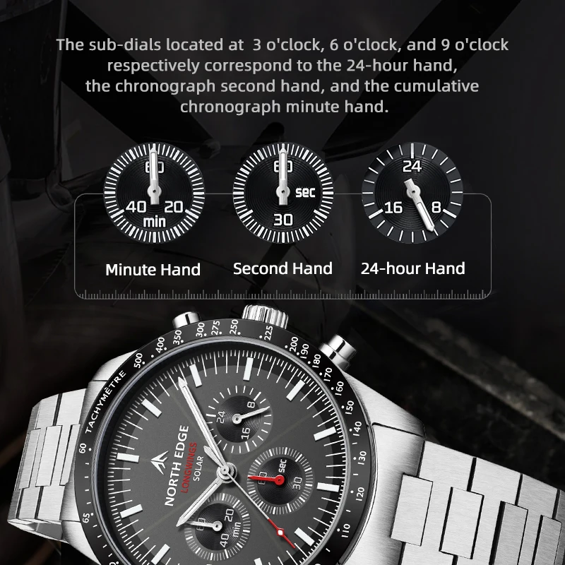 The sub-dials located at 3 o’ clock, 6 o’ clock, and 9 o’ clock respectively correspond to the 24-hour hand, the chronograph second hand, and the cumulative chronograph minute hand.