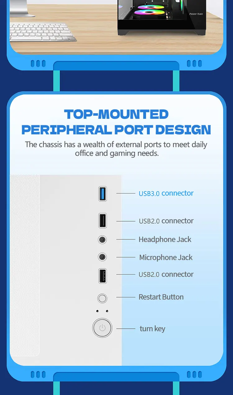 - Front Ports: USB3.0*1/USB2.0*1/HDAUDIO/