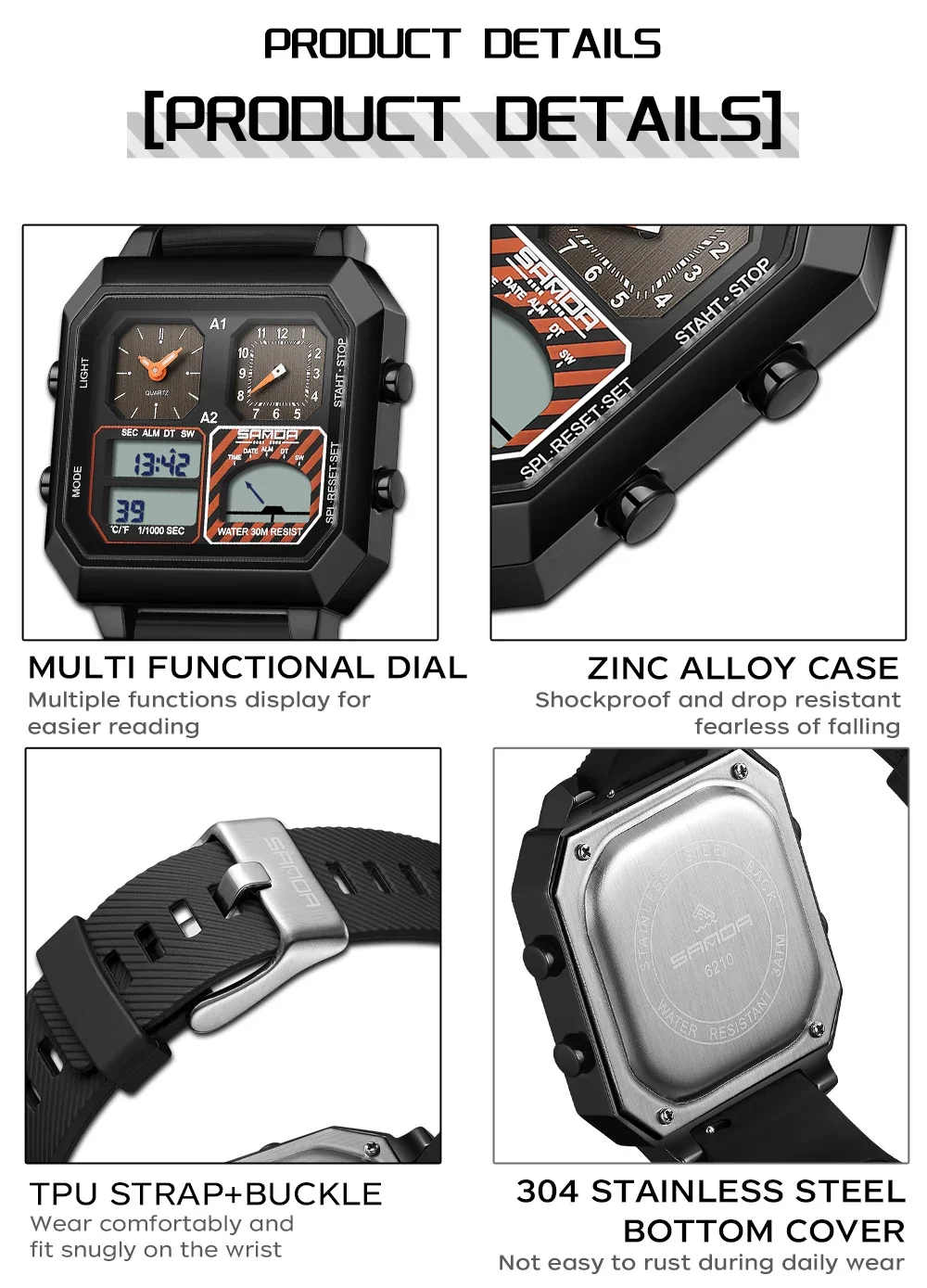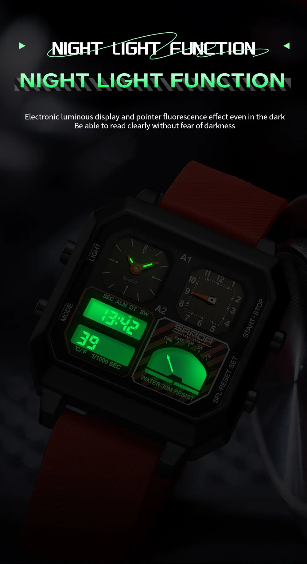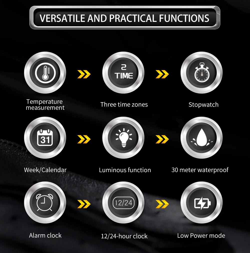 FeatureLuminous,LED display,Complete Calendar,Multiple Time Zone,Alarm,Week Display,Temperature MeasurementWater Resistance Depth3Bar