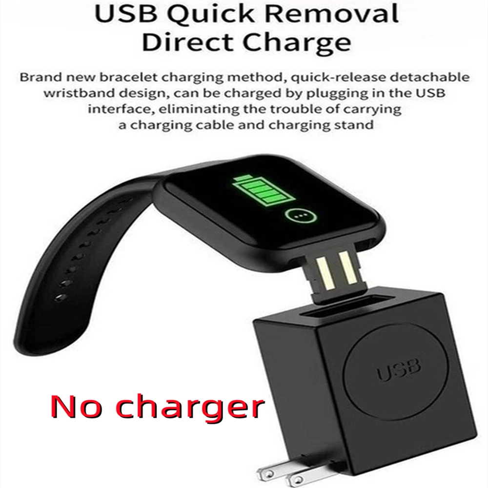 Package Contents: 1 x Smart Watch, 1 x Manual, 1 x box (Note:No Charger. Watch can be insert the phone charger to charge or inserted into the computer USB port. Dear buyers, this watch does not require a charging cable, it can be charged directly through the charging head or USB interface.The box may be damaged after long transportation, but the watch is fine, please understand.)