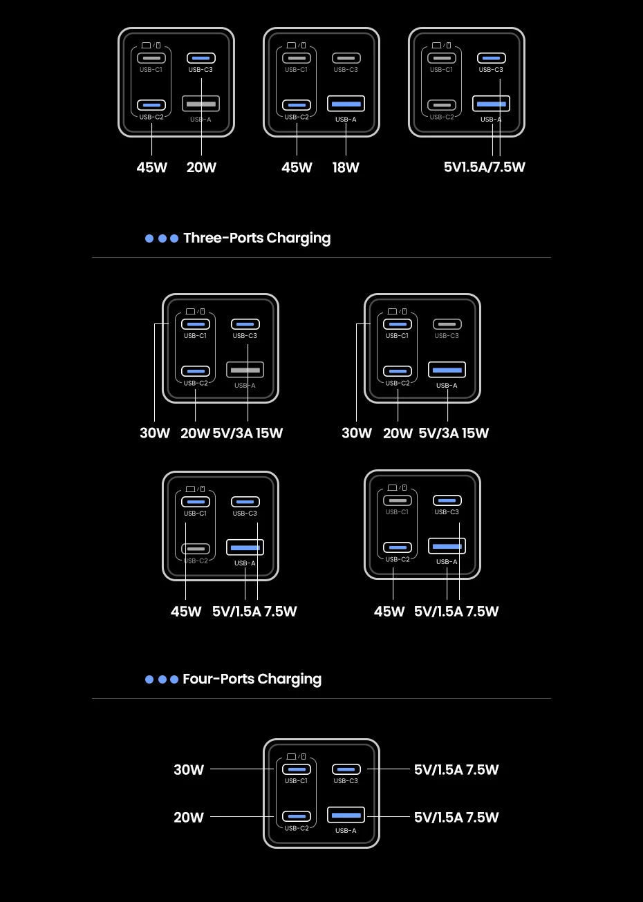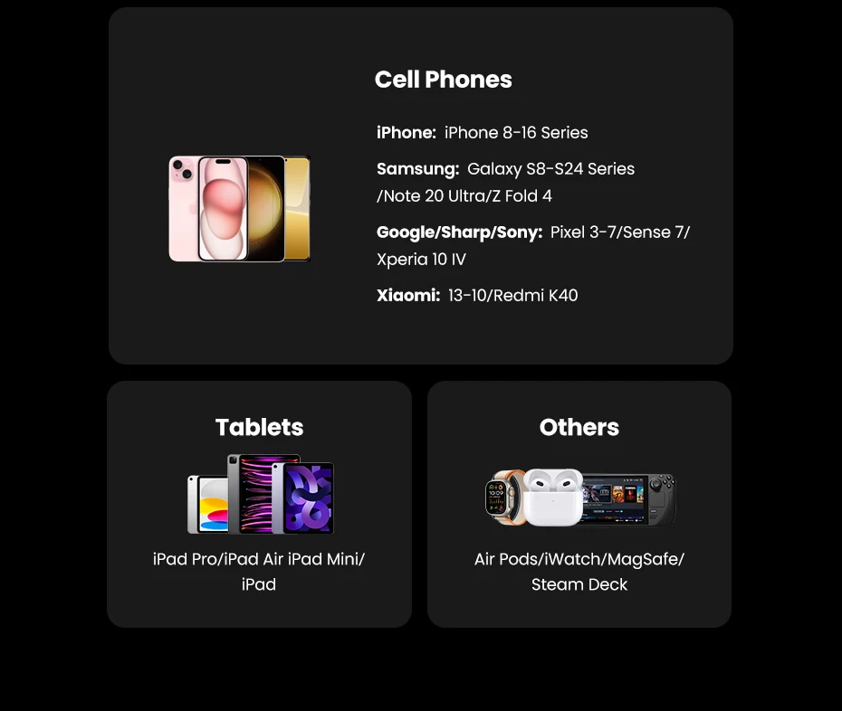 - Applied Fast Charge Protocols: Samsung Adaptive Fast Charge,Huawei FCP,USB PD,BC1.2,Qualcomm Quick Charge,Huawei Quick Charge