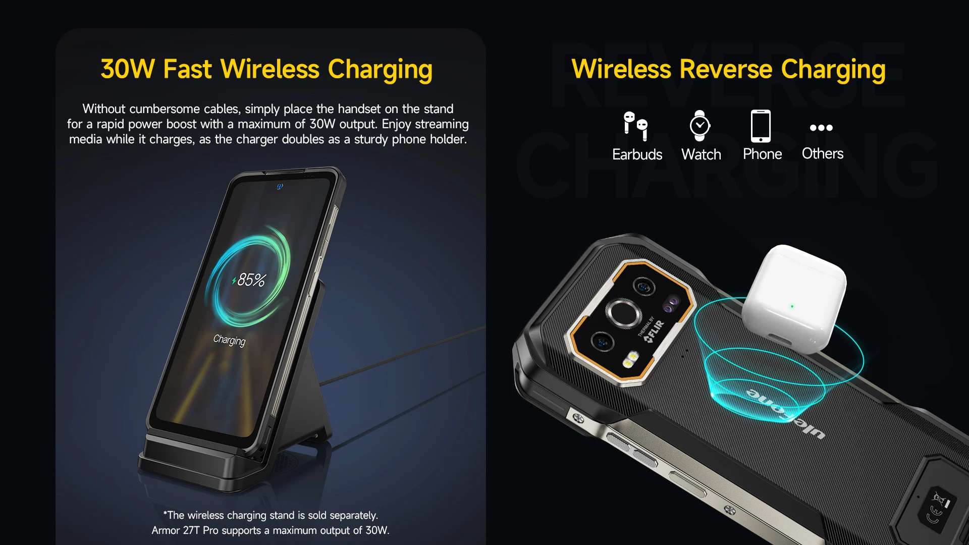 Support 30W Wireless Charge ( 16V1.5A, Ulefone private protocol)Примечание: При беспроводной зарядке WCS01 мощность может достигать только 30 Вт |