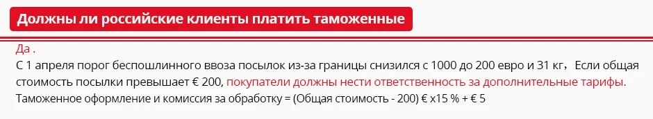 1: Import duties and taxes are the buyer’s responsibility, our price does not include any custom taxes. If the parcel get strict inspected by custom. You still need to pay tax to clear custom. We won’t bear the customs taxes. The cost of return would be on customer due to reject customs clearance.