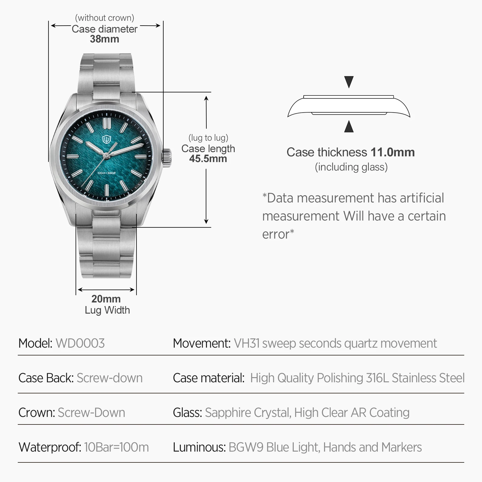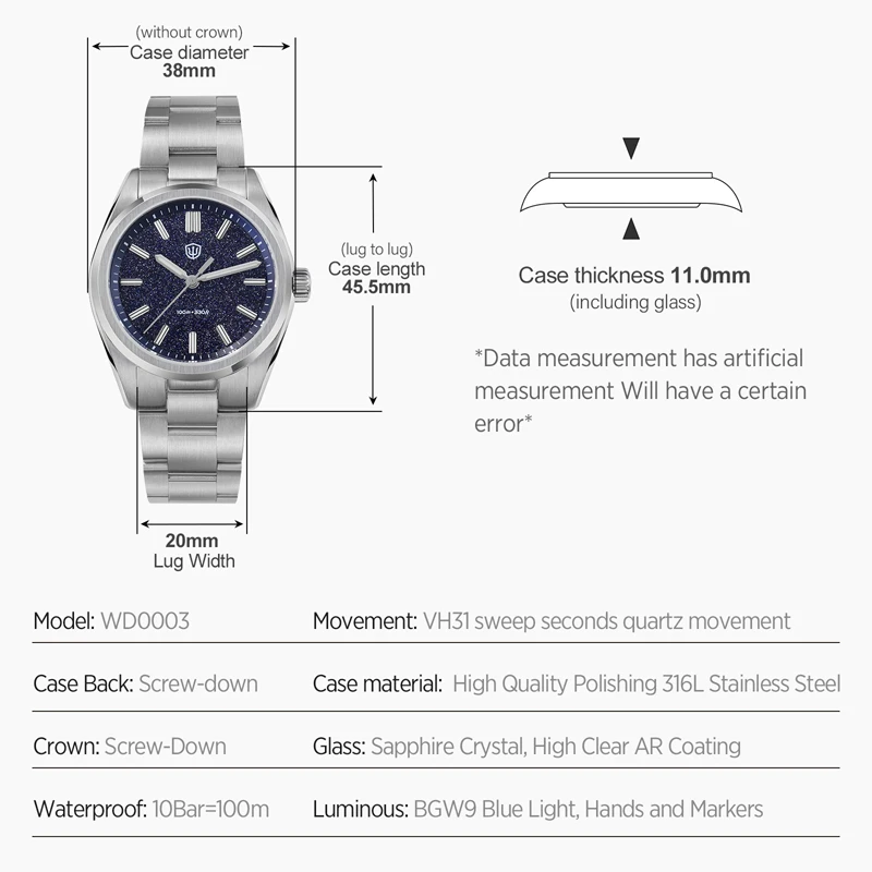 Watchdives WD0003B Original Design Aventurine Dial Men Watch VH31 Sweep Seconds Quartz Movement 36mm Watches Luminous Waterproof 100m