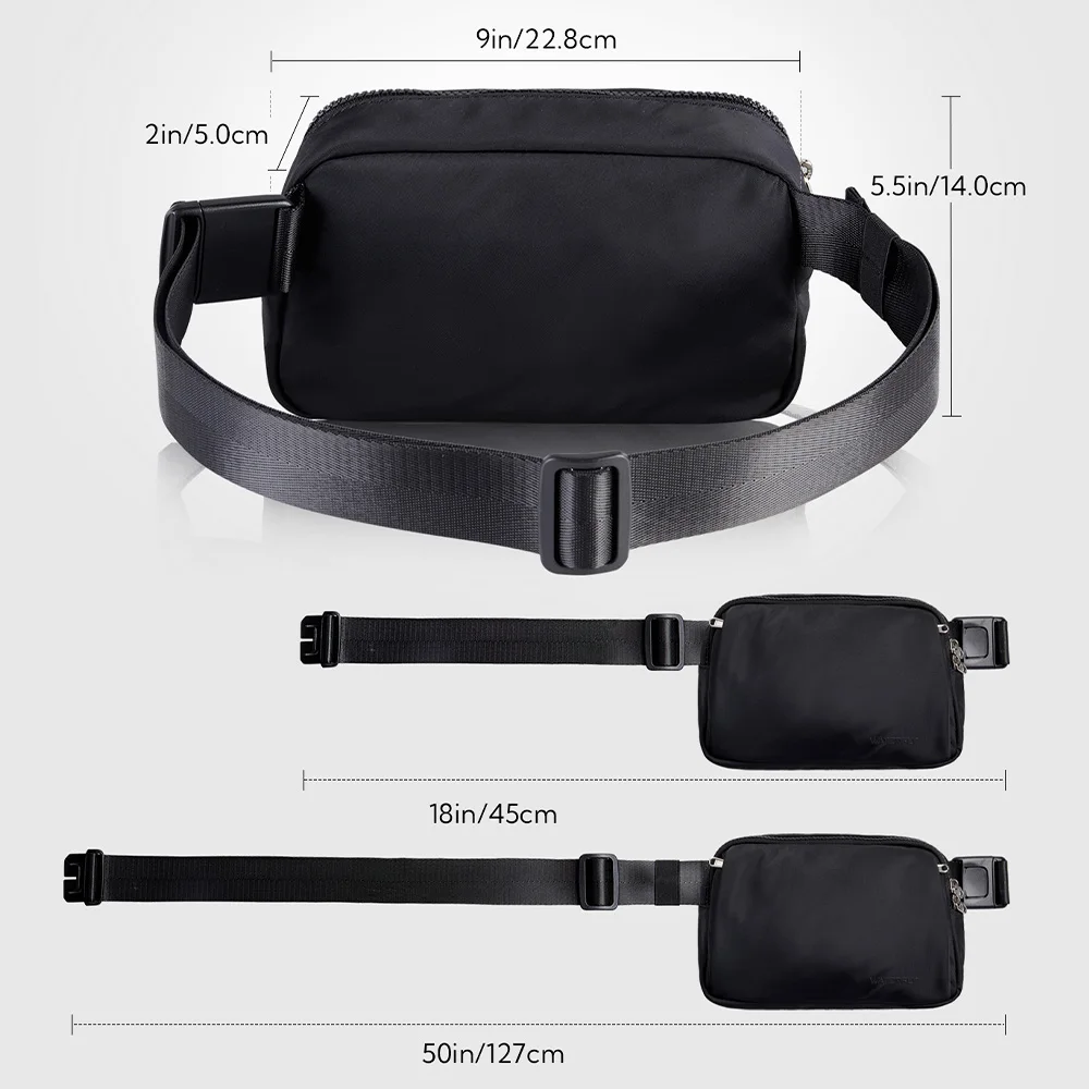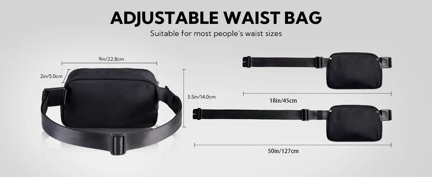 PHONE POCKETS WITH EXCELLENT DESIGNED: Unique two pockets on both sides are specifically designed for quick access to all cell phones, or other items. The Size of the belt bag is 9 x 5.5 x 2 inches and waist sizes from 18″ to 50″ with adjustable strap