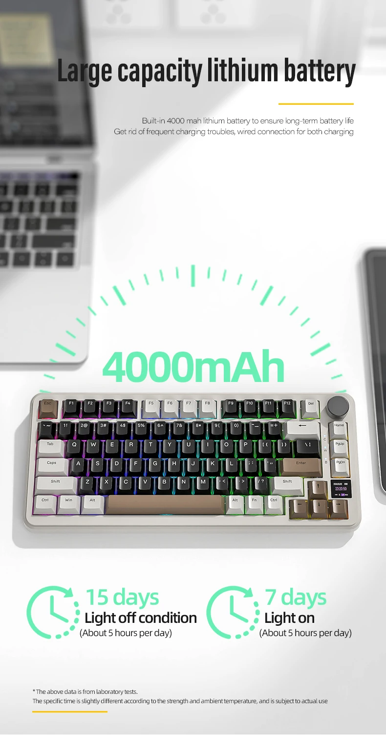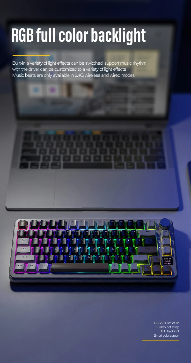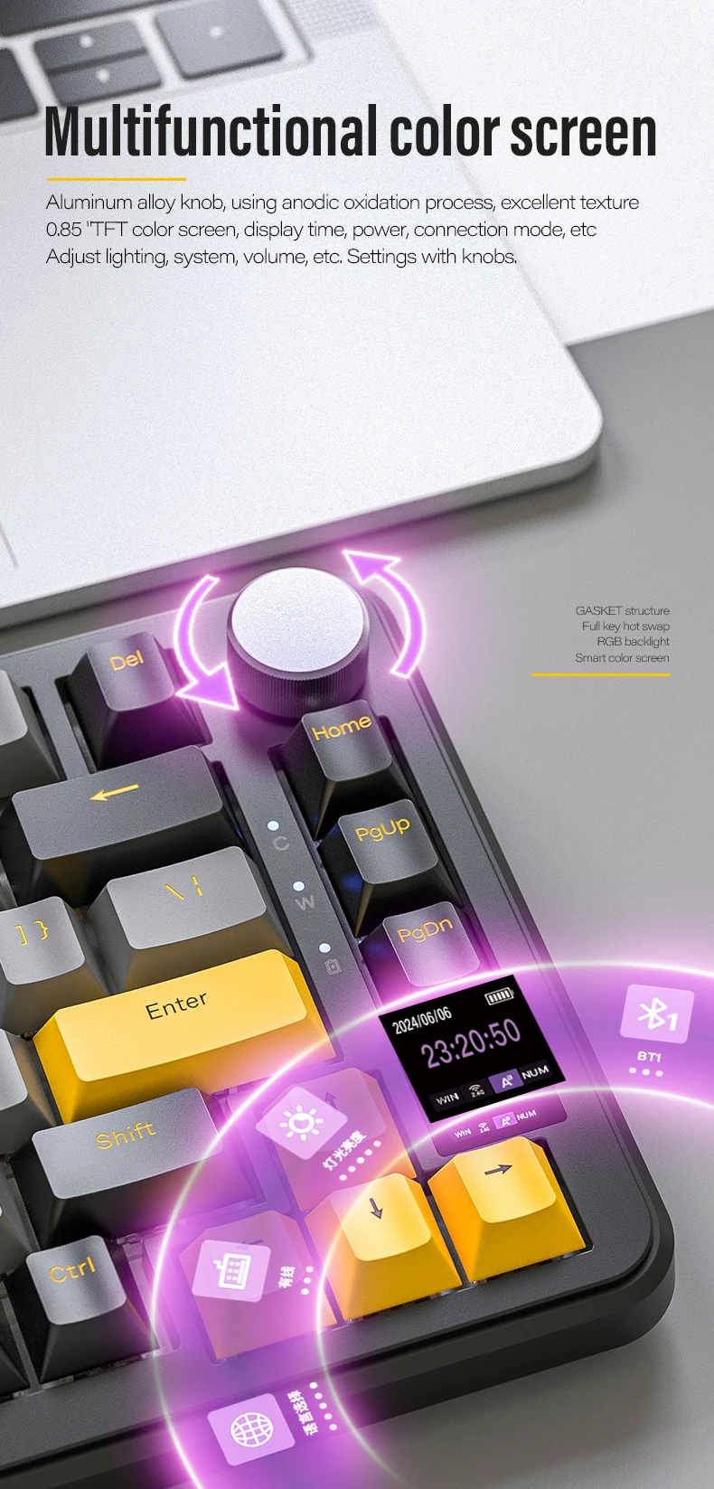 • TFT colour screen :Highly bright wear-resistant TFT colour screen, time, date, power, connectivity and other keyboards, status at a glance, you can also customize the GIF animated pictures, custom pictures, view the power, connectivity, system switching, light effects adjustment, volume adjustment.