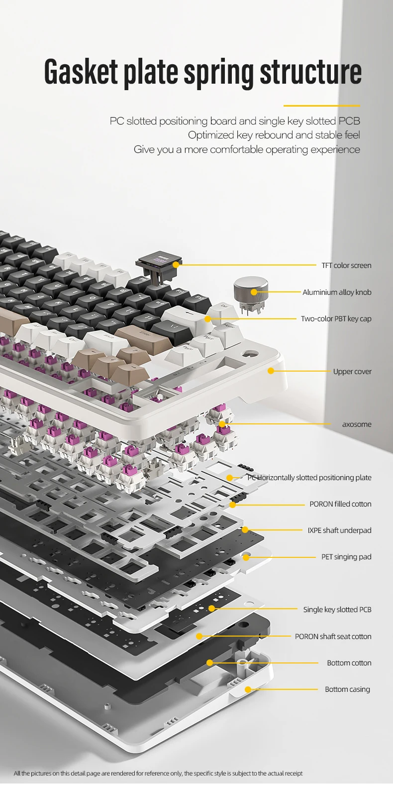 • Gasket leaf spring structure :customised silencing package, sandwich cotton with + IXPE under-axis pads + PET sound-optimised pads + PORON padded cotton + bottom padded silicone, with GASKET structure, optimised for hard collision generated by the murmur to make the sound more pure.