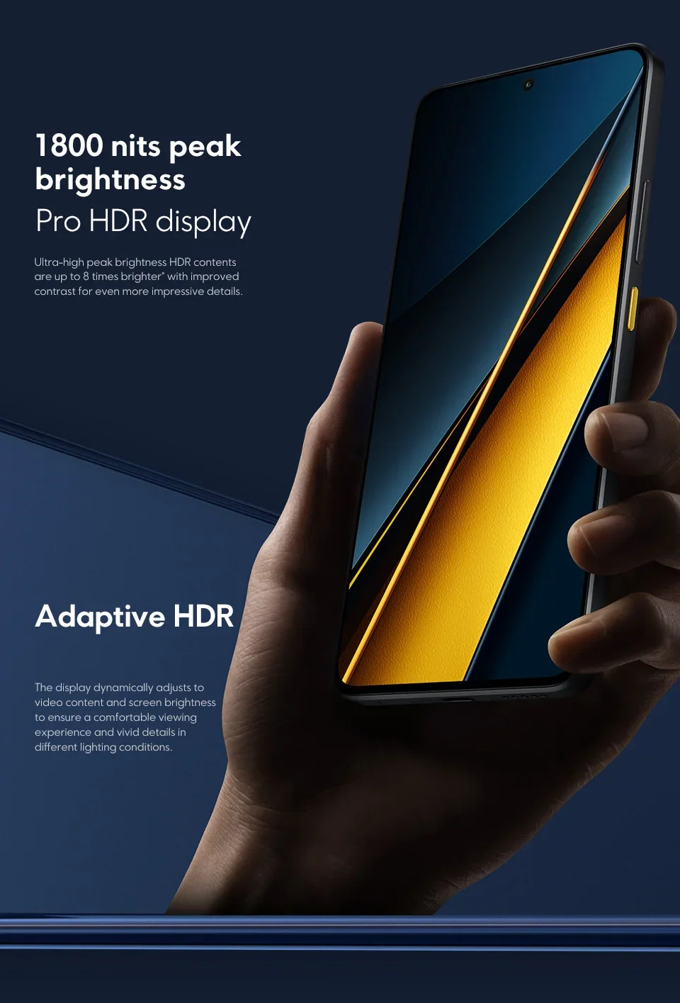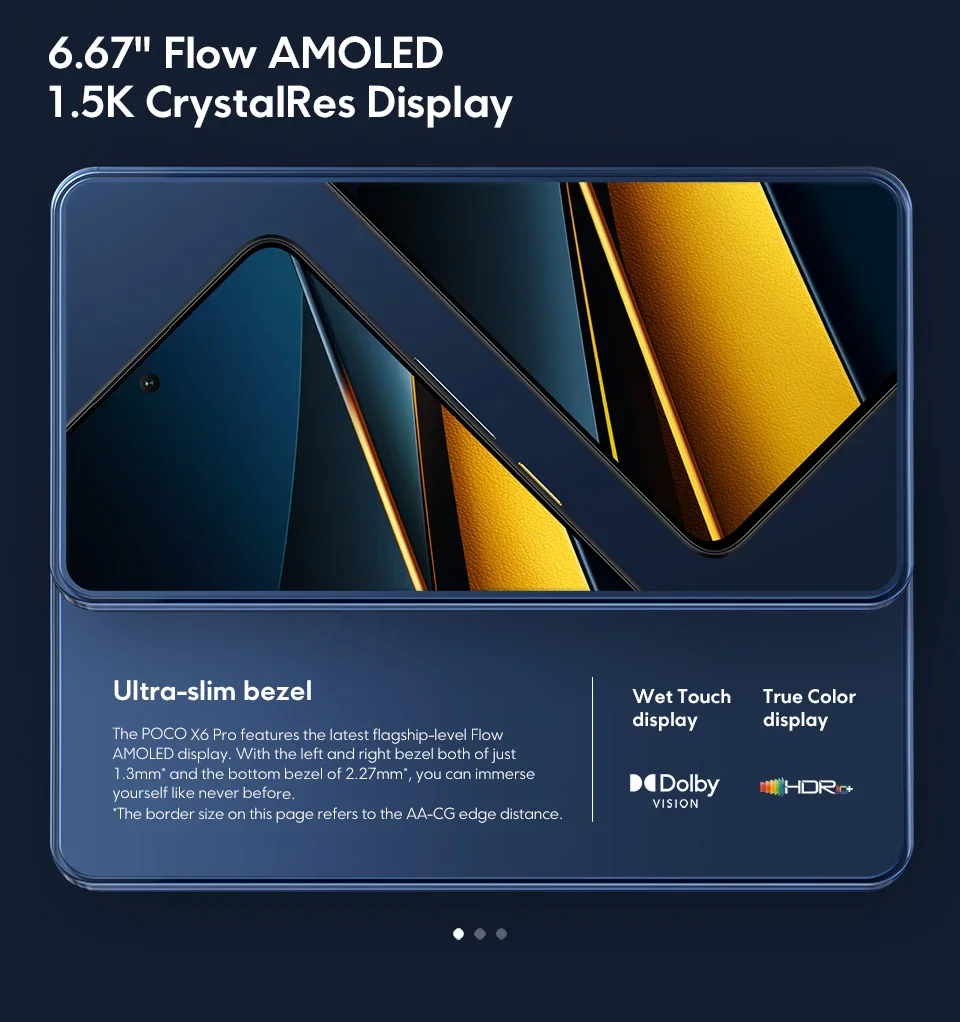 The POCO X6 Pro features the latest flagship-level Flow AMOLED display. With the left and right bezel both of just 1.3mm* and the bottom bezel of 2.27mm*, you can immerse yourself like never before.
