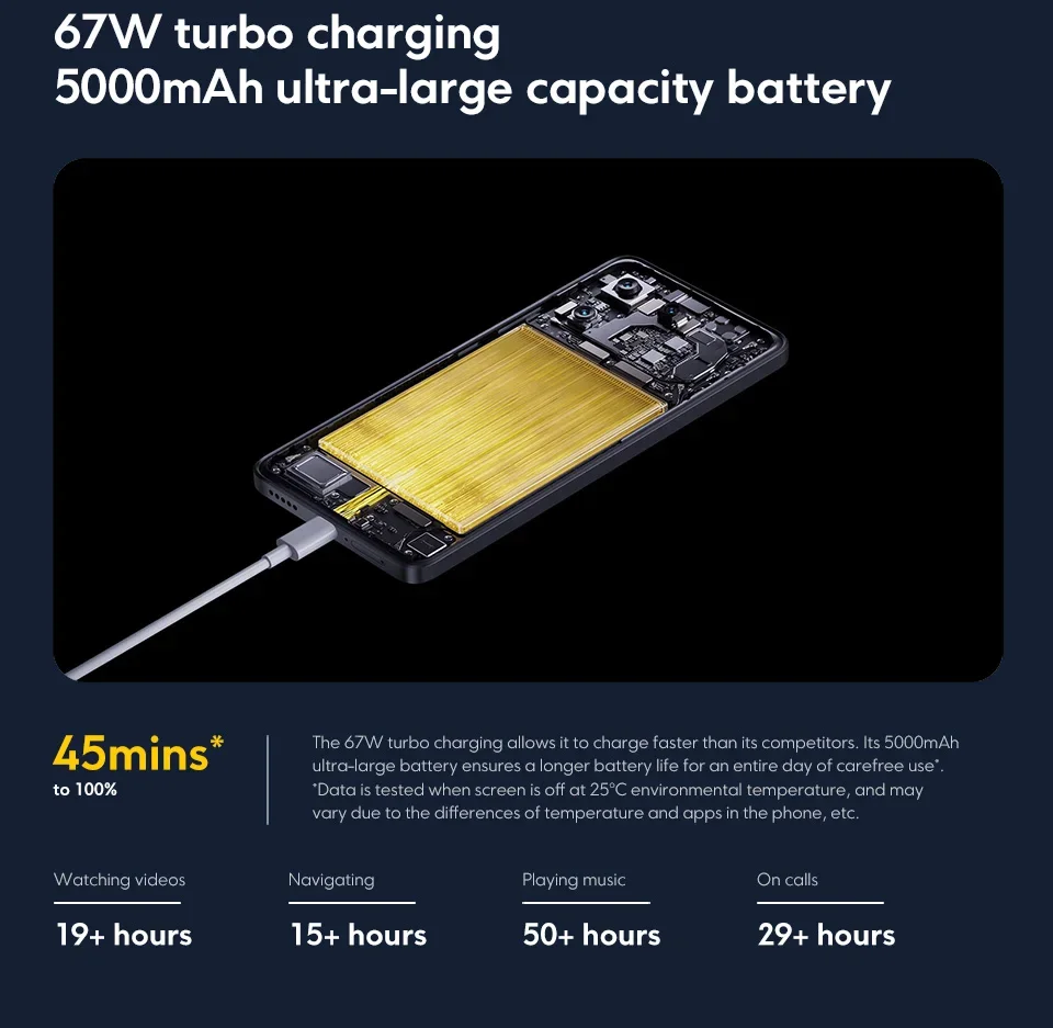 Battery ——— 5000mAh (typ) battery, 67W turbo charging