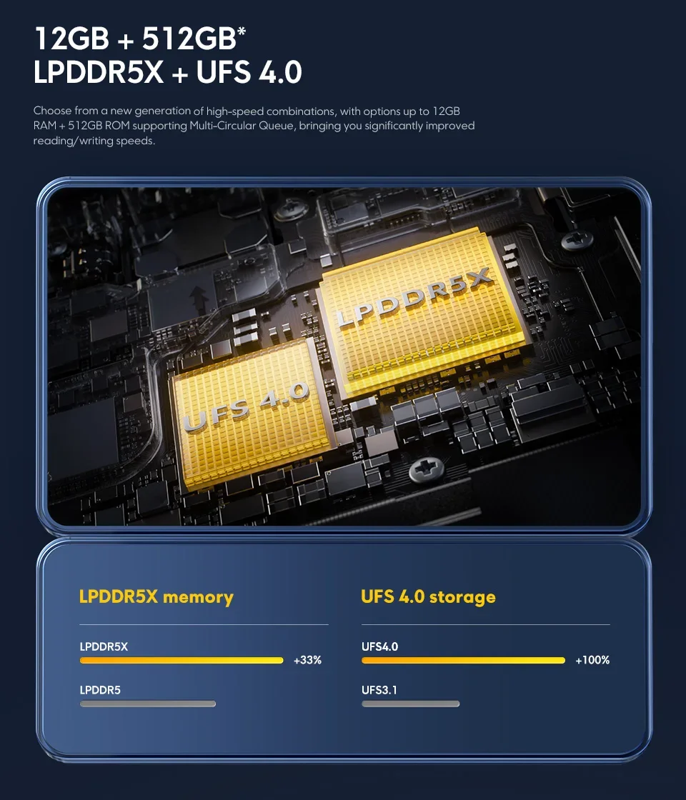 Choose from a new generation of high-speed combinations, with options up to 12GB RAM + 512GB ROM supporting Multi-Circular Queue, bringing you significantly improved reading/writing speeds.
