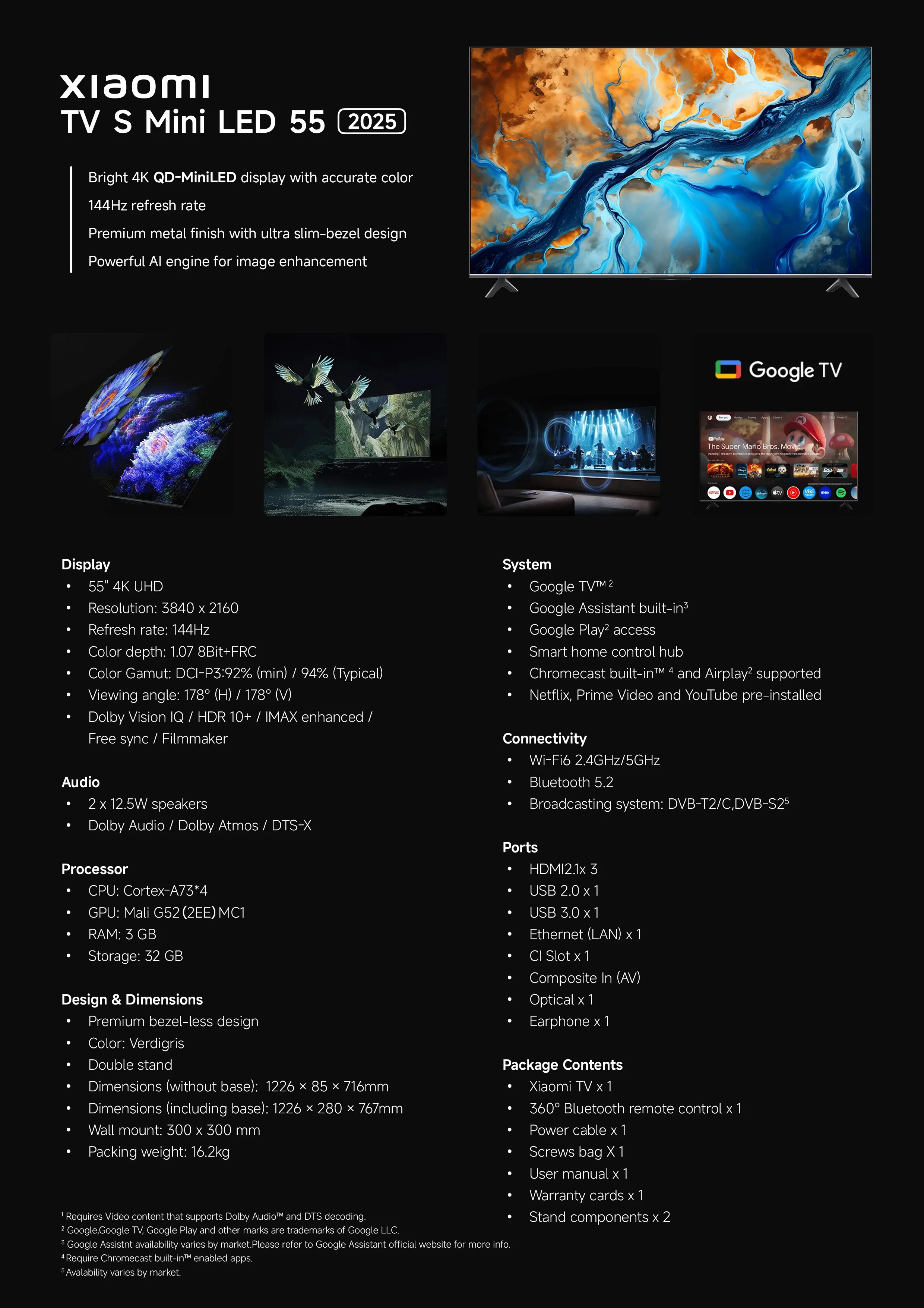 Experience seamless motion and vibrant colors with the XIAOMI S MINI 55 144Hz QD-Mini LED display, perfect for gaming and movies.