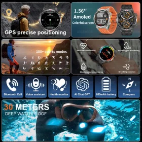 2026 New Outdoor Sports Smartwatch Men GPS Positioning 650mAh HD Call 1.56-inch AMOLED Screen Compass 5ATM Waterproof Watch Man