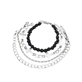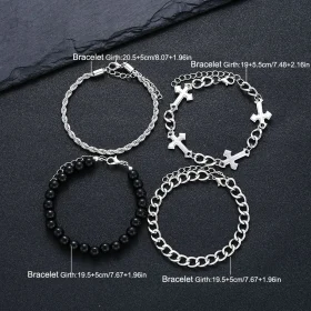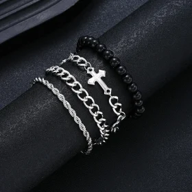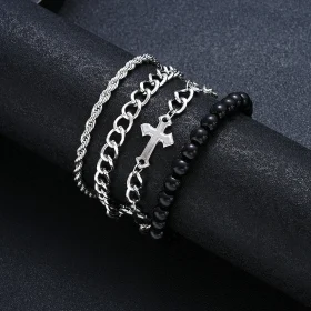 Retro Stainless Steel Cross Balck Beads Multi-layer Bracelet Hip Hop Silver Color Men Bracelet INS Jewelry Trendy Accessories