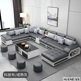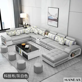 MINGDIBAO Fabric Sofa Set Furniture Living Room Sofa Set with USB and Stools / Big U Shape Cloth Couch Sofas for Home Furniture