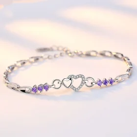 New 925 Sterling Silver Bracelet Purple Crystal Zircon Heart For Woman Charm Bracelet Jewelry Gift