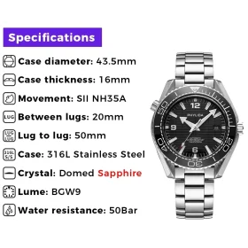 PHYLIDA 500m Men’s 43.5mm Automatic Diver Watch Black Dial Sapphire Crystal Skyfall Special Edition Ceramic Insert NH35A